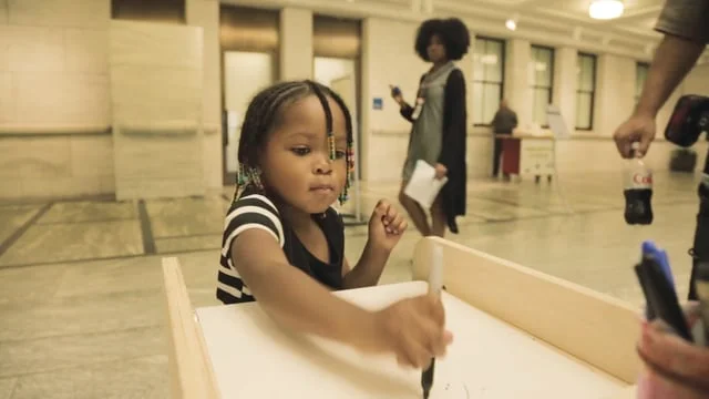 “Exquisite Corpse” is a parlor game popularized by surrealists in Paris in the 1920s. It was initially a game for writers in which each participant would add a word or a phrase to a story and allow the work to evolve in unexpected ways. The drawing version is similar: visitors/artists add to a drawing without seeing what came before. The game embraces chance and randomness. The results are often unpredictable and interesting.