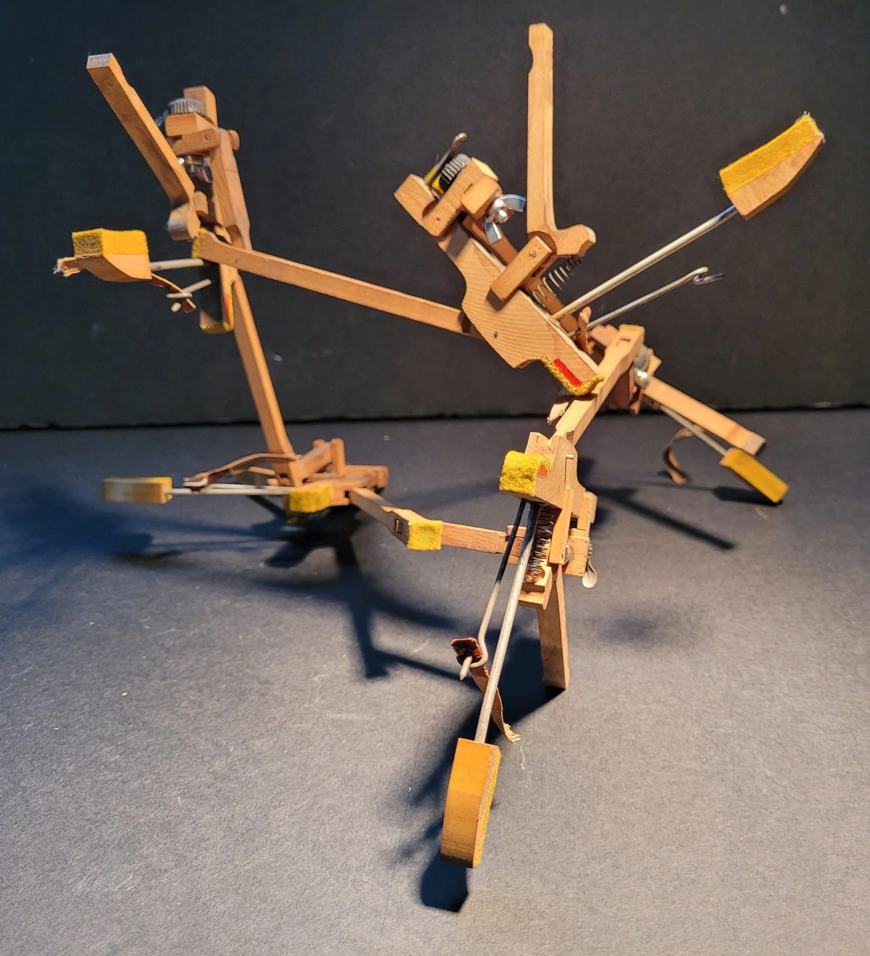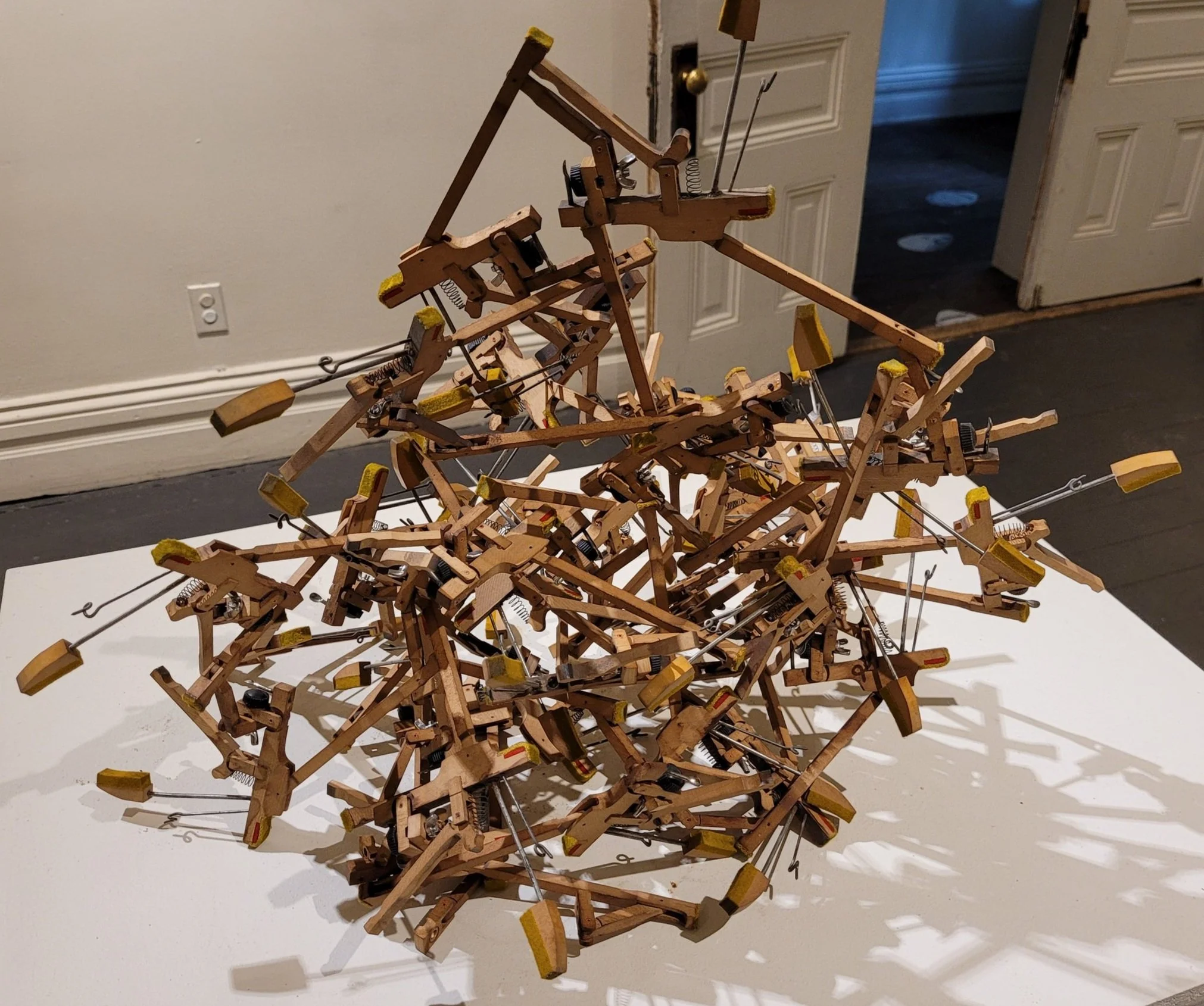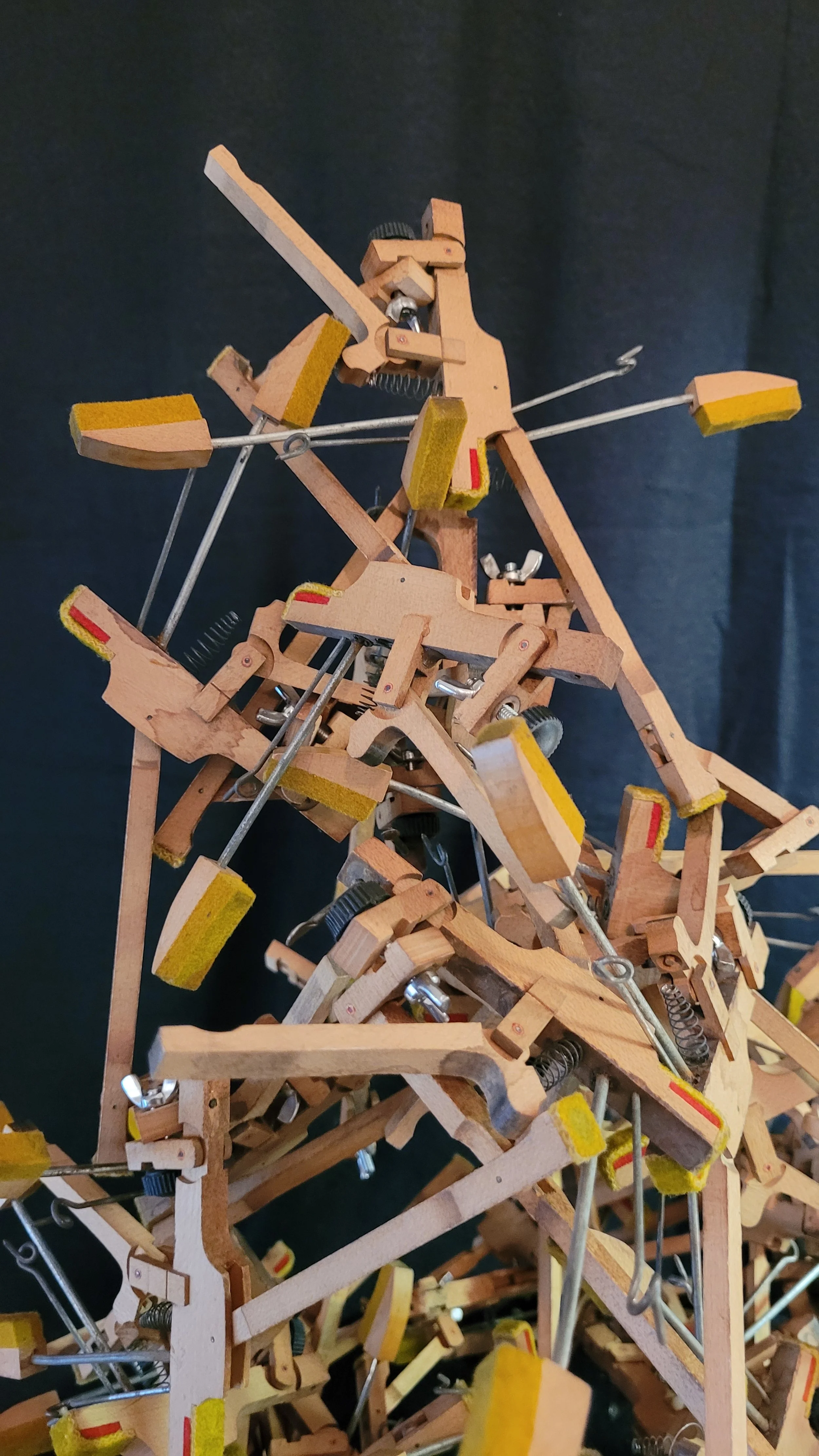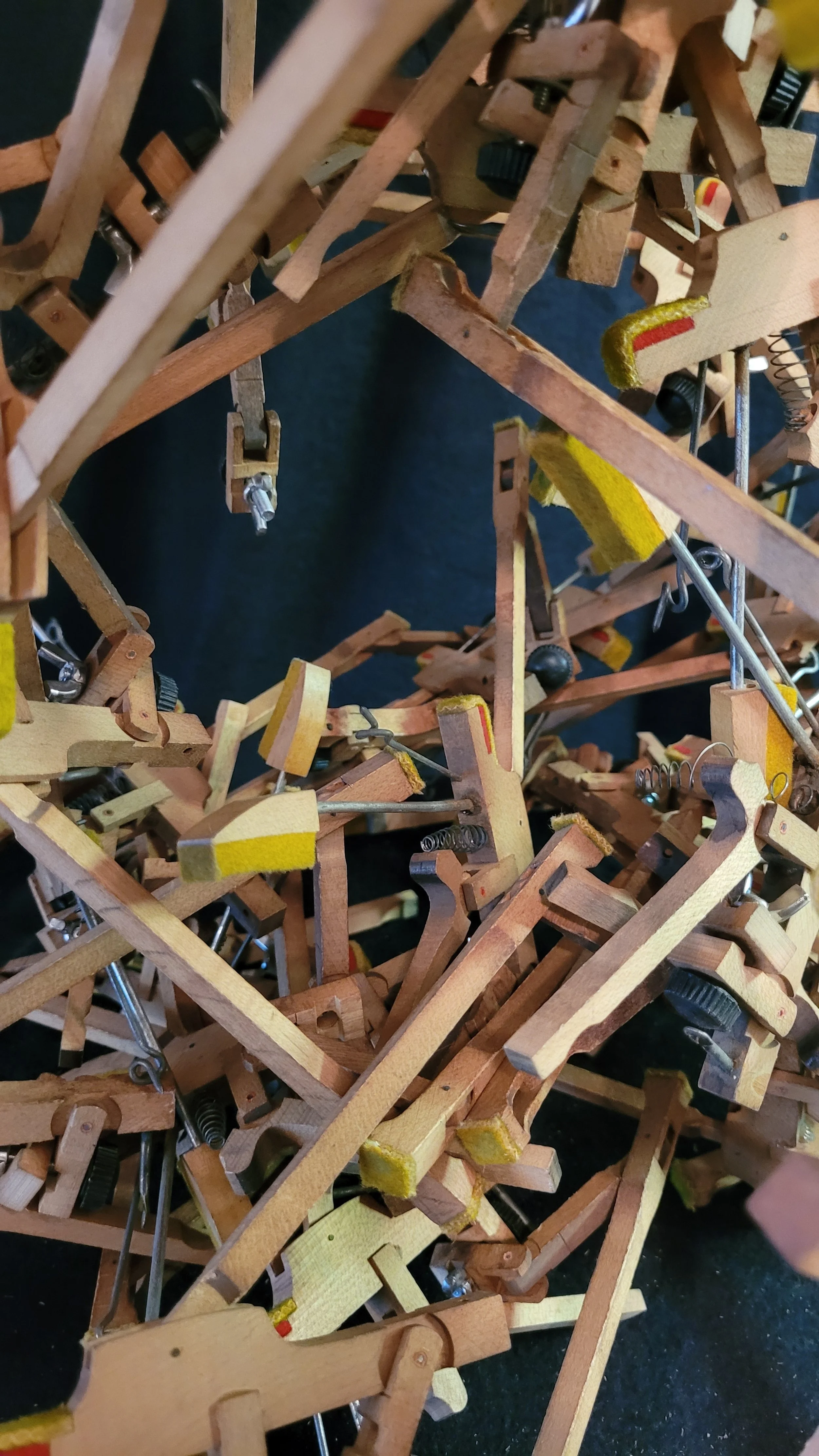 A cast-off piano has an abundance simple machines, seamlessly working together to form a complex apparatus. Inspired by its hidden mechanics, I set out to create a playable sculpture that repurposes the components. I was fascinated by a piano’s “whippen assembly”: an elegant series of levers and linkages that transforms the press of a key to the resonant strike of the string.