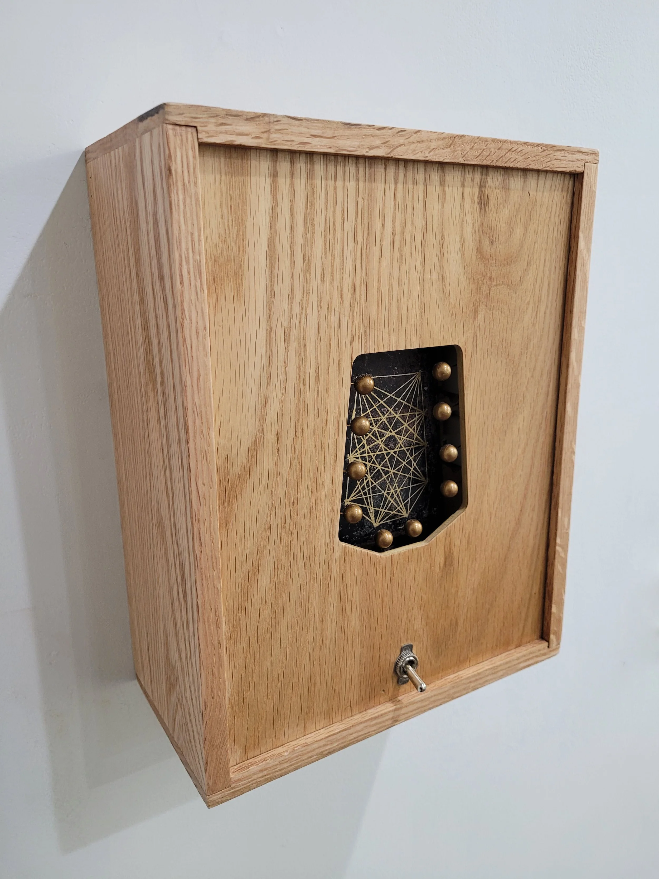 “Sacred Geometry” was inspired by mechanized Arti temple drums and bells which are used in Hindu devotional rituals. The rhythmic beats awaken the divine and signal the start of a sacred ritual. A switch on the front activates a mechanism causing mallets to strike a bell. The lines connecting the mallets create a geometric form which evokes the “interdependent web of life” as celebrated by the Unitarian Universalist tradition. The web emphasizes the deep connections between all entities in our ecosystem. We must be aware that how our actions affect others and that all play a role in keeping the balance.